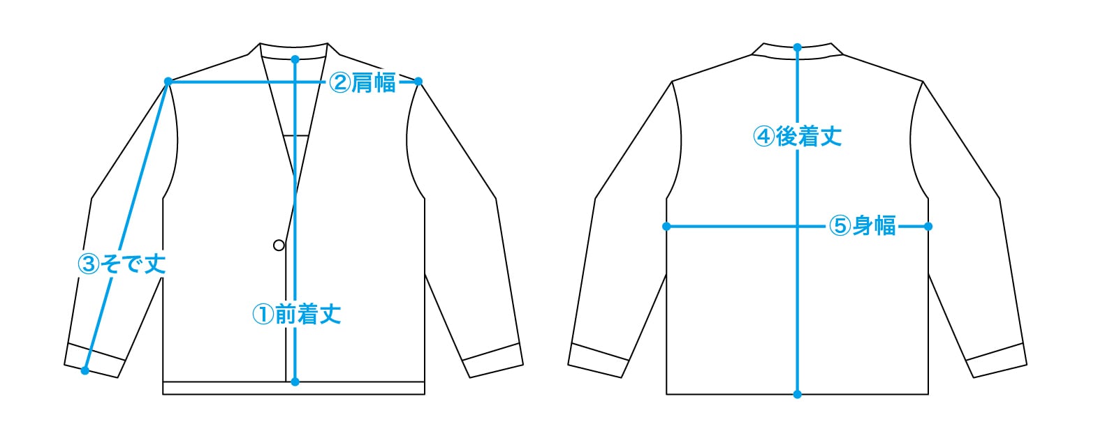 ● サイズ:L(①前着丈 79 cm/②肩幅 60 cm/③そで丈 56.5 cm/④後着丈 82 cm/⑤身幅 71 cm)